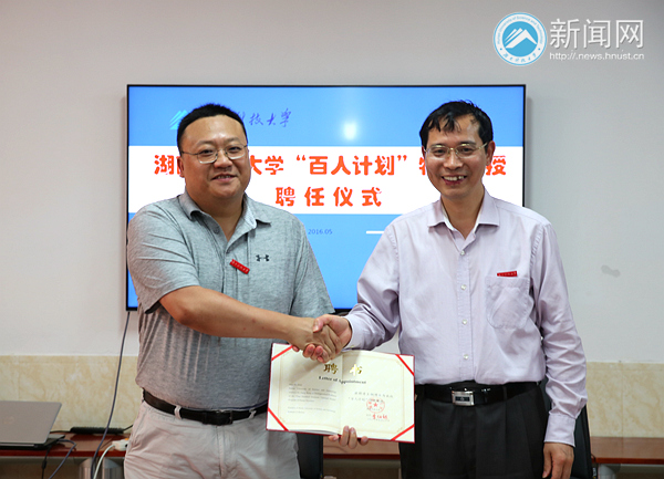 朱川曲代表学校与特聘教授签订聘任合同并为受聘教授颁发聘书、佩戴校徽,人事处处长陈春萍宣读省委组织部聘任文件。