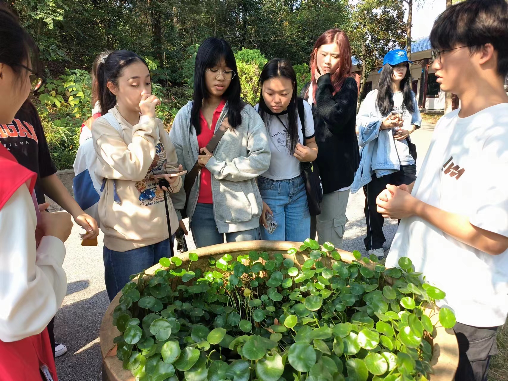 在功能池,留学生们认识铜钱草,了解中国古代钱币知识
