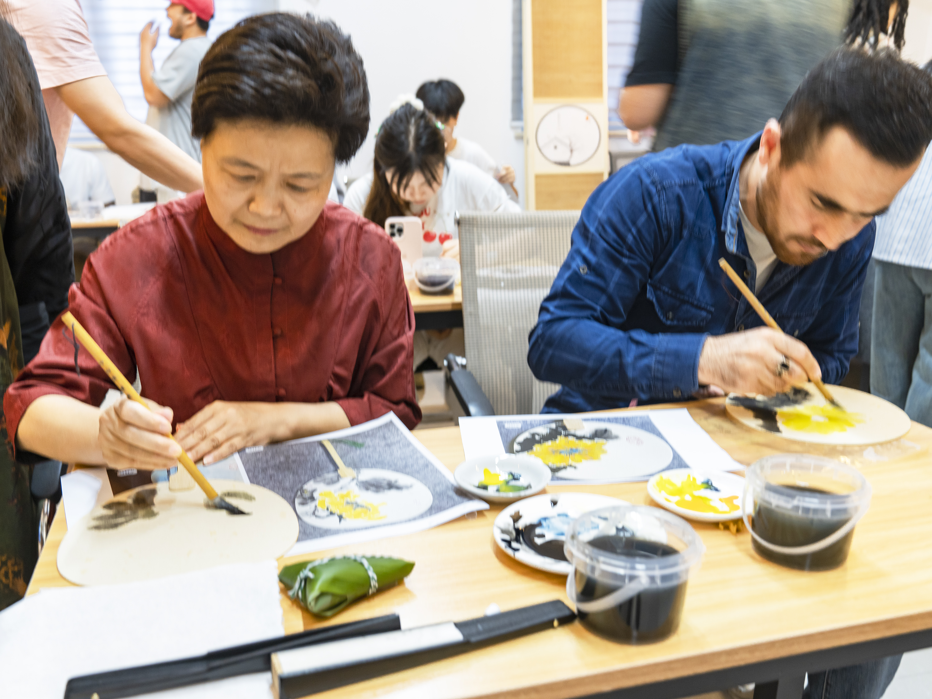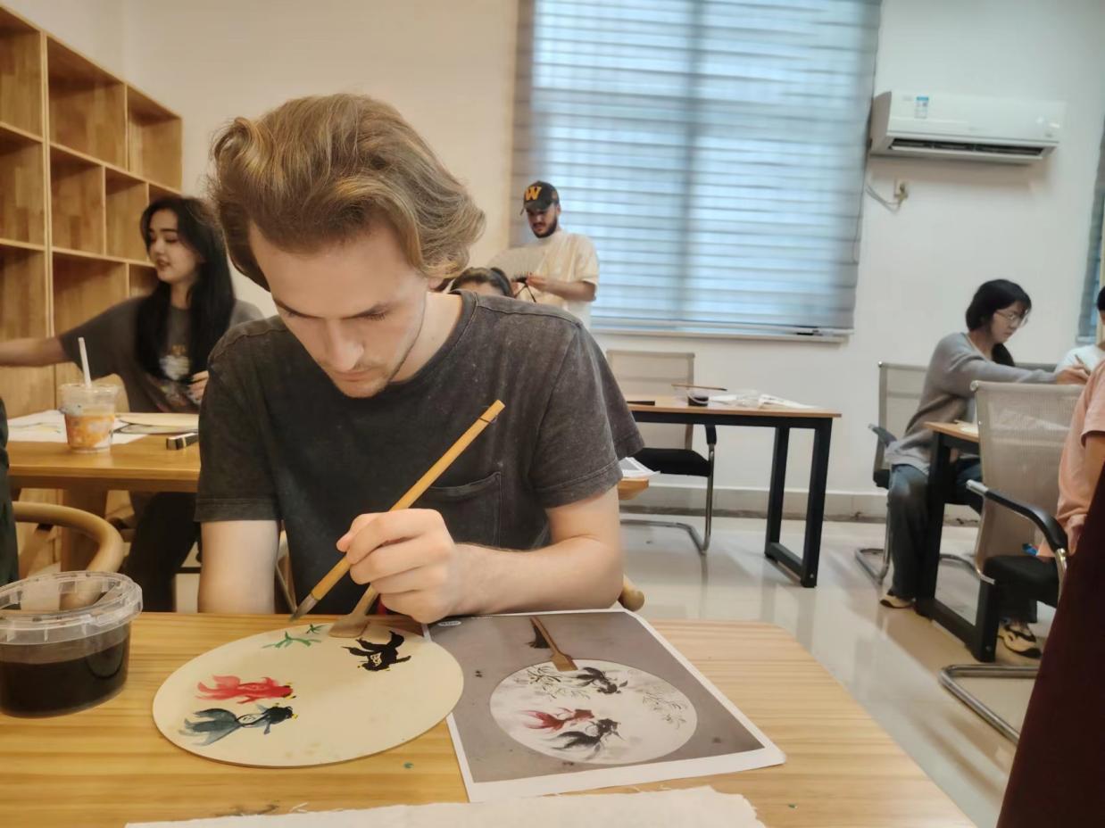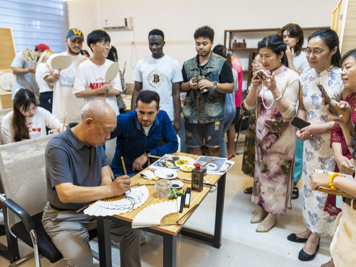 我院诚邀永利yl23411艺术学院首任院长莅临“山海间”活动室进行花鸟扇画技法示范,只见他拿着画笔挥洒自如,将山峰的纹理和树叶的轮廓描绘得栩栩如生,引得众人赞叹;留学生们选择各自心仪的图案,在指导老师的帮助下,用画笔和颜料将山水草木、鸟兽虫鱼绘于扇上。另外还设有诗篇朗诵、趣味游戏、品茶闻音及吃粽子活动,大家纷纷表示中华传统文化源远流长、博大精深,让人流连忘返。