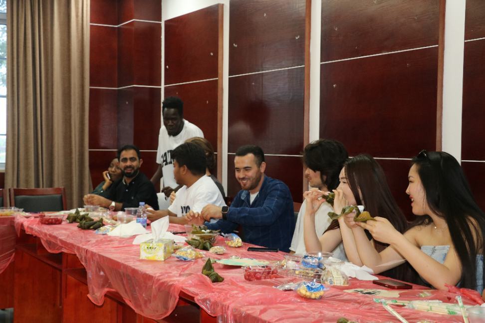 活动在大厅开始,桌子上摆放着粽叶、糯米及线绳,留学生们围在桌前,倾听指导老师讲解包粽子的步骤。塔吉克斯坦留学生阿卜学着老师的模样,捋粽叶、做漏斗状、填糯米、压紧实、封口、扎捆,包粽子一气呵成,“我是第一次包粽子,虽然包的有点丑,但我也体会到了自己动手包粽子的乐趣”他这样说道。