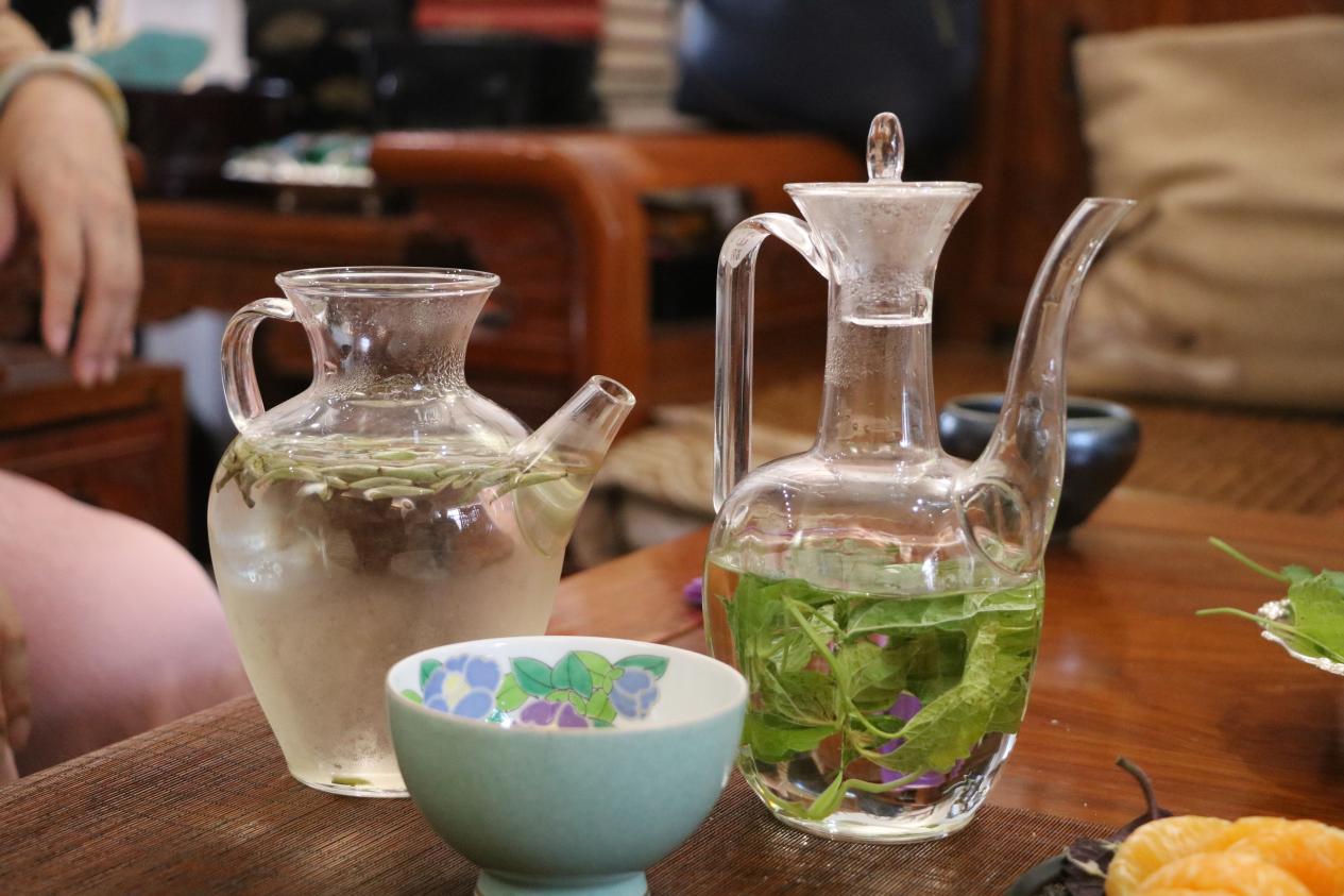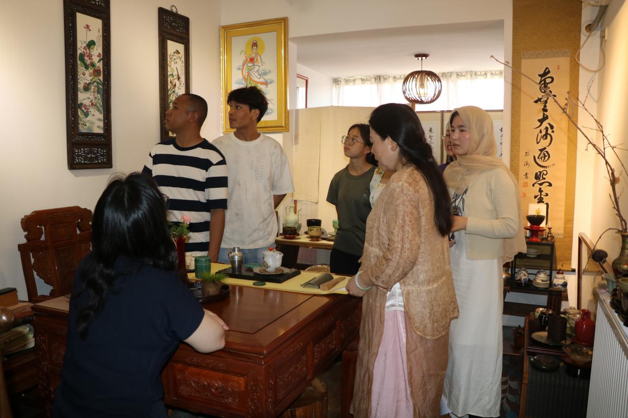 中国人饮茶,尤为注重一个“品”字。留学生们依次品尝了刘老师提前泡好的夏季冰茶:绿茶、薄荷茶、白茶。茶的风味各有不同,每一种茶所搭配的传统茶具亦极为讲究,将茶的色香味形韵展现的淋漓尽致。作为茶事生活美学的践行者,刘老师的茶室摆放着精致的茶道具,墙上的挂画,桌上的插花,伴随着流淌在空间里的古琴音乐,留学生们仿佛进入了茶文化的古典世界,度过了一段宁静而又放松的时光。“水味甘腴偏宜煮,茗非陆羽莫能辨。”品茶间隙,刘老师讲述了自己在“茶圣”陆羽故里与点茶时天上飘下来一根羽毛落在茶席上的奇妙缘分,并提到了诗人卢仝的《七碗茶诗》,“蓬莱山,在何处?玉川子乘此清风欲归去”。在若茗苑中,刘老师以优雅、娴熟的技法,为留学生们展示泡茶的精妙艺术。她缓缓提起茶壶,滚烫的热水如丝绸般注入茶杯。普洱熟茶在水中舒展,芬芳四溢,沁人心脾。留学生们围席而坐,细品着茶的醇香,回味着茶的韵味。
