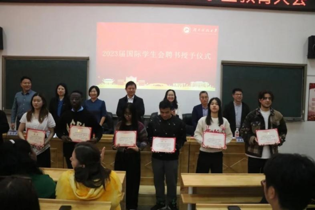 副校长王进与在座领导一同为2023届留学生会成员颁发聘书。新一届留学生会代表也上台发表感言,表示将不负众望,全力以赴为大家创造更加和谐、多彩、美好的留学生活。