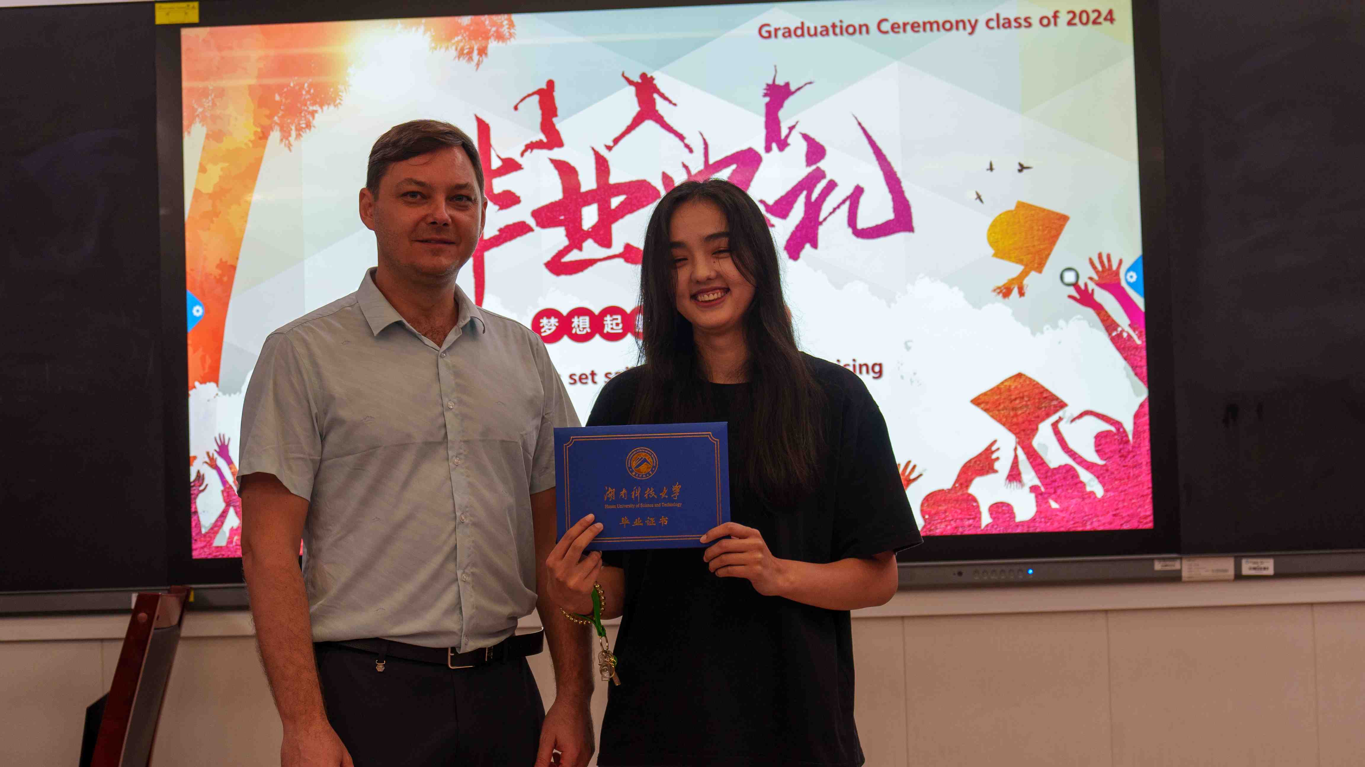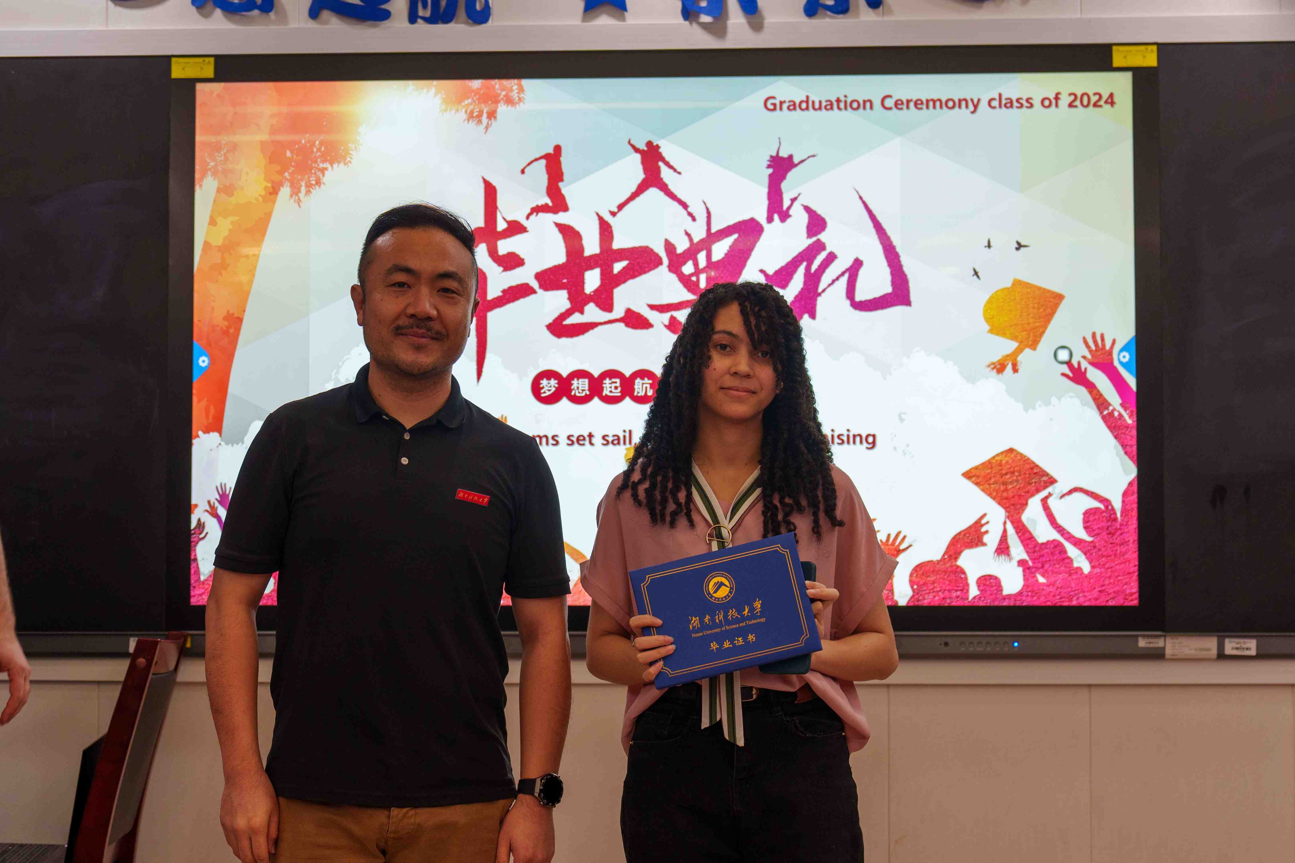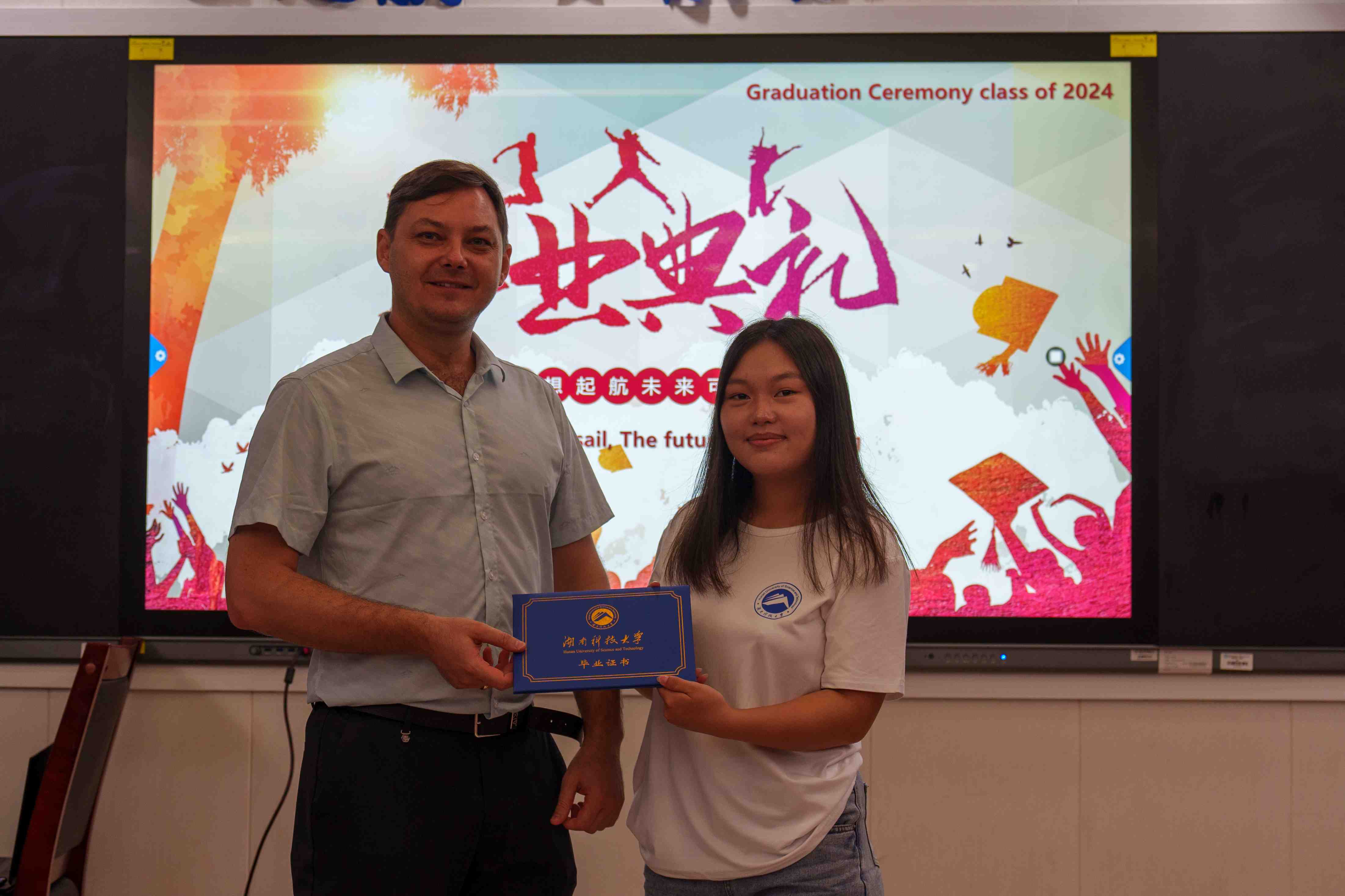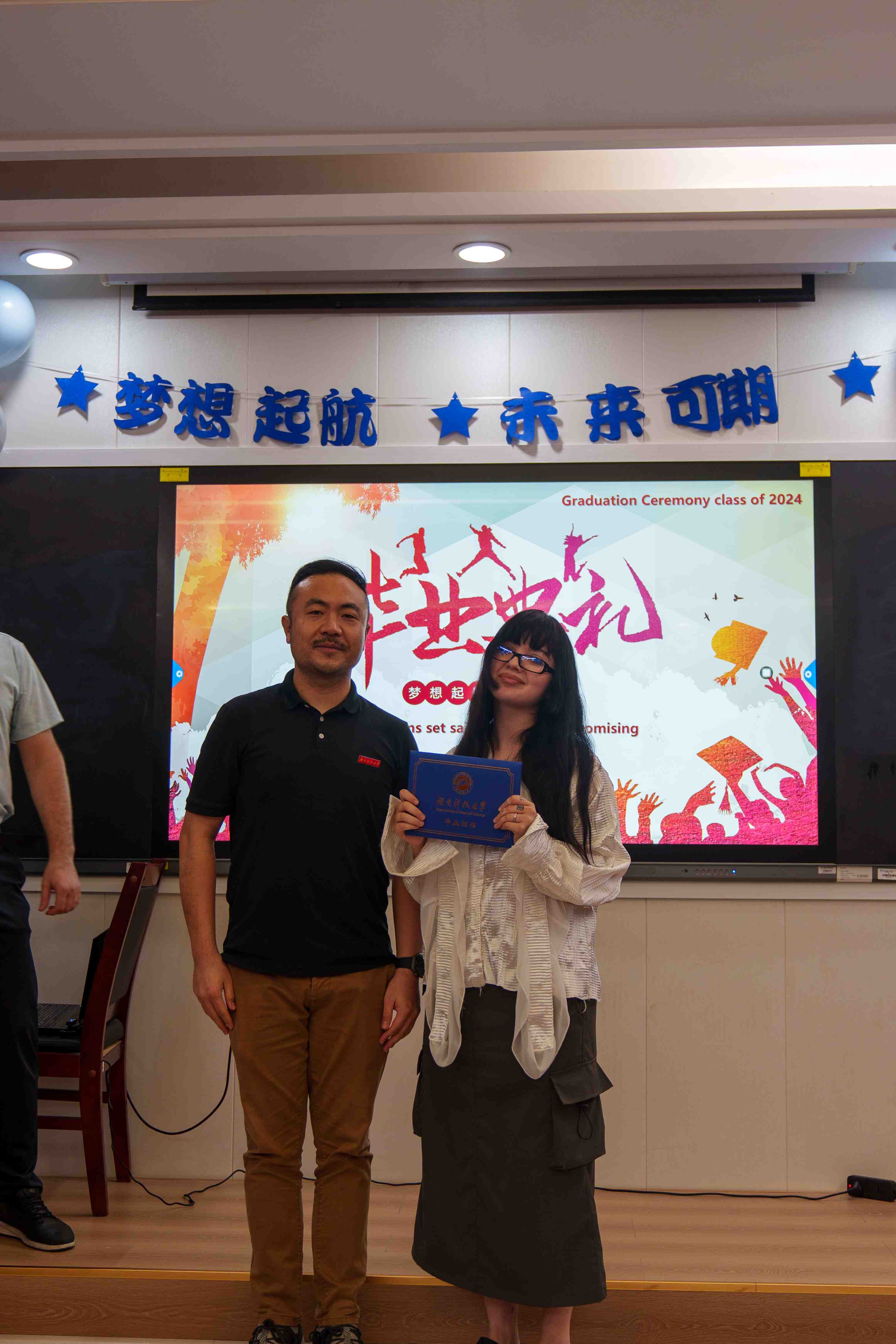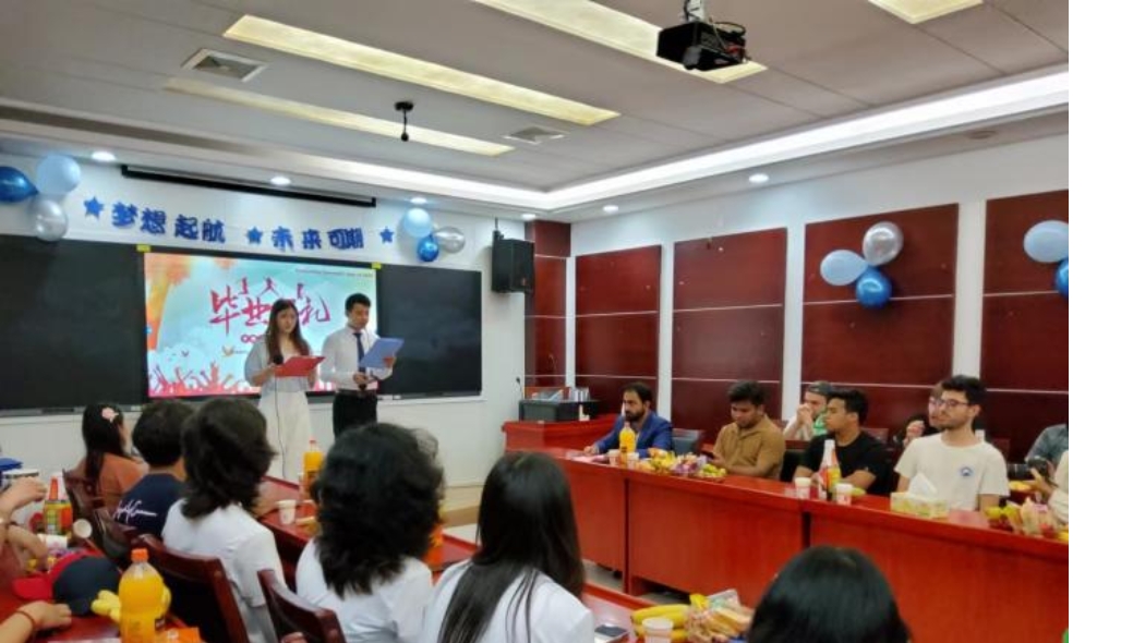 在典礼上,语言生班长阮玉珍同学与大家分享了她的国际学生活和感受。她的话语中充满了对校园生活的怀念和对同窗们的感激之情,同时也表达了对未来的憧憬和期待。她的分享让在场的每一个人都深感共鸣。随后,在校国际学生代表王才同学上台为即将离校的同学们送上最真挚的祝福。他的祝福中充满了对同窗们的依依不舍和美好祝愿,让人感受到了友谊的温暖和力量。