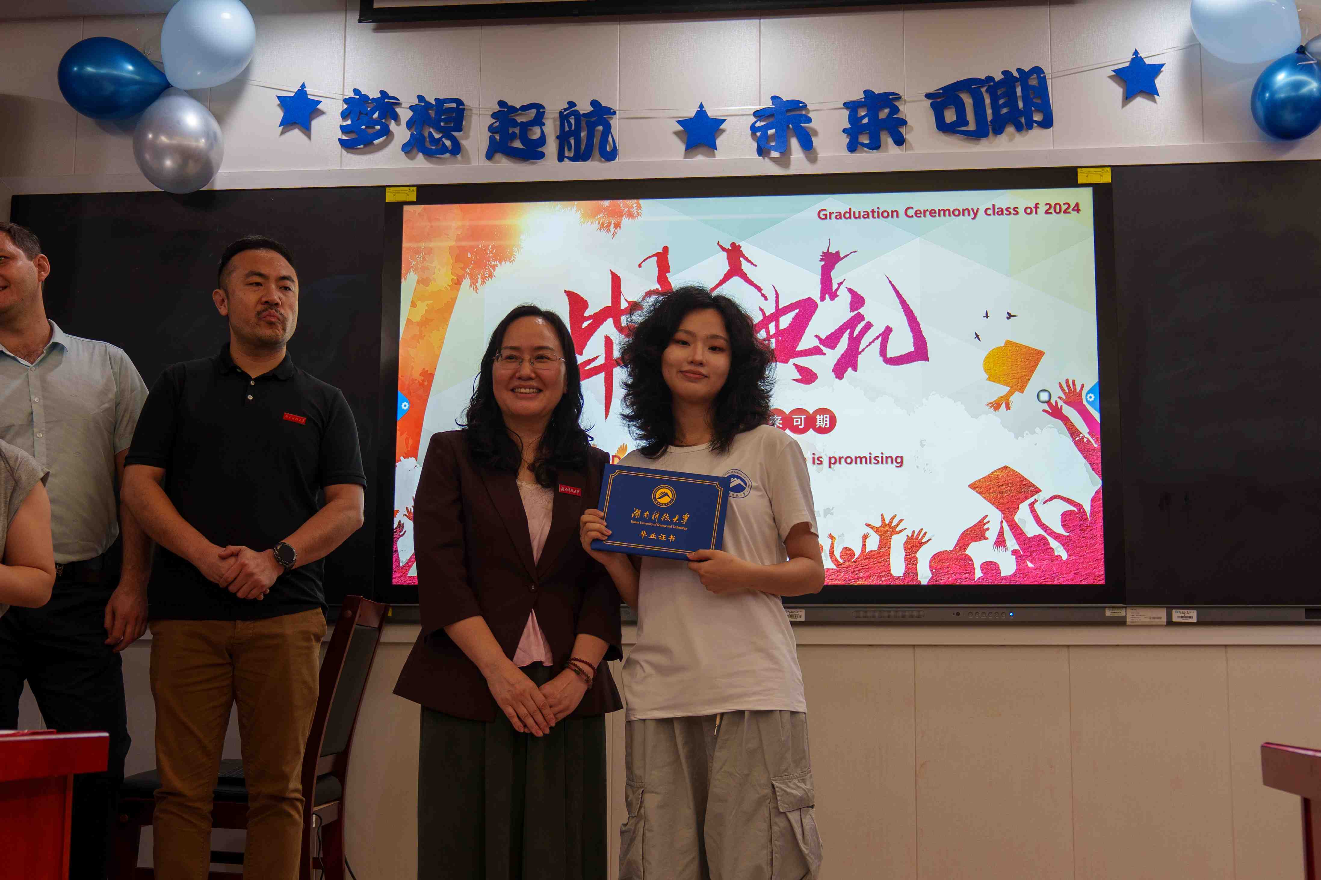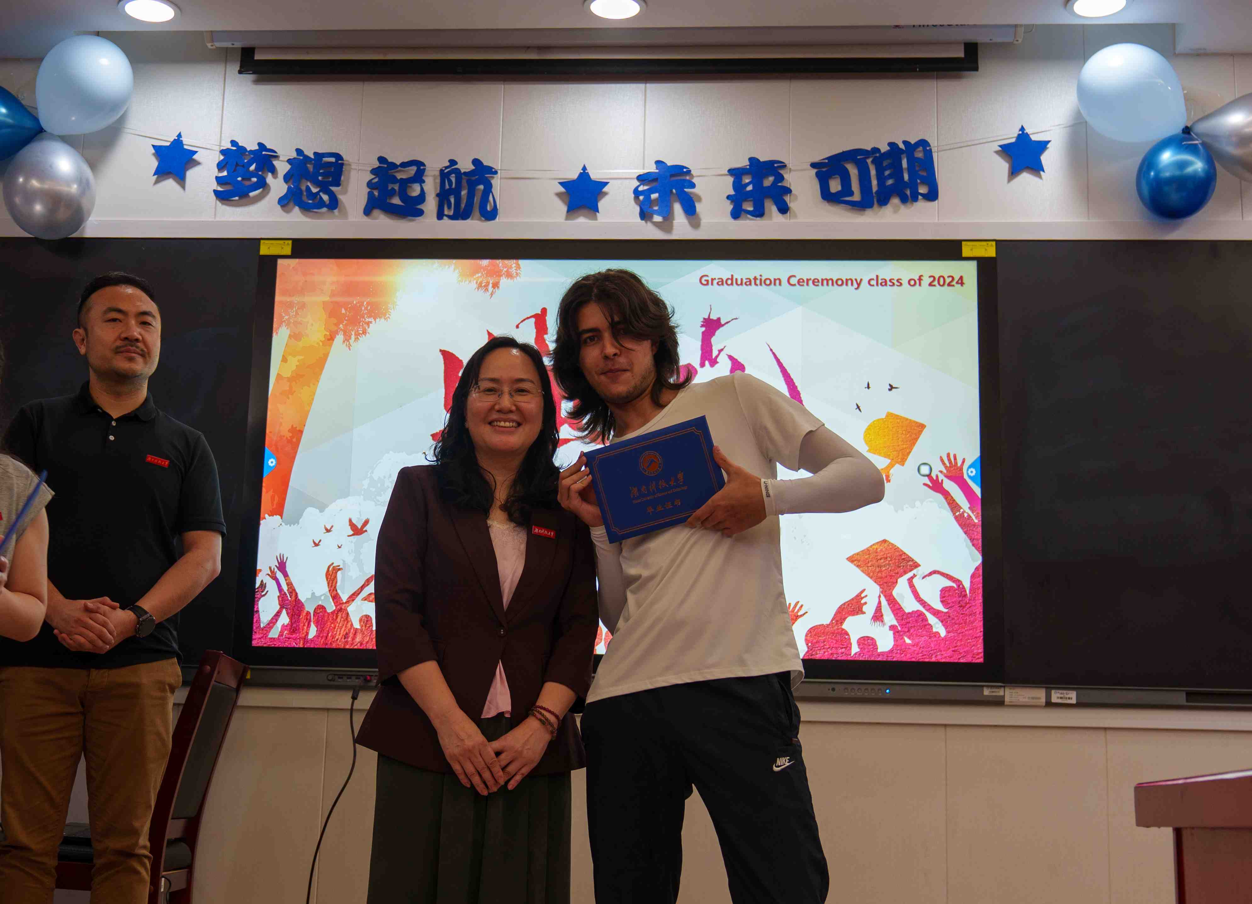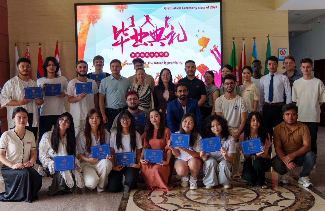 紧接着,激动人心的时刻到来。学院领导为优秀国际学生毕业生们颁发了结业证书,这是他们国际学生涯的最好见证。毕业生们面带微笑,满怀激动地从领导手中接过证书,这一刻的荣耀与自豪将永远铭记在心。为了留下这美好的瞬间,老师们和所有的同学们一起合影留念。随着快门声的响起,一张张照片记录下了这一刻的欢笑与泪水,也见证了国际学生们的成长与蜕变。