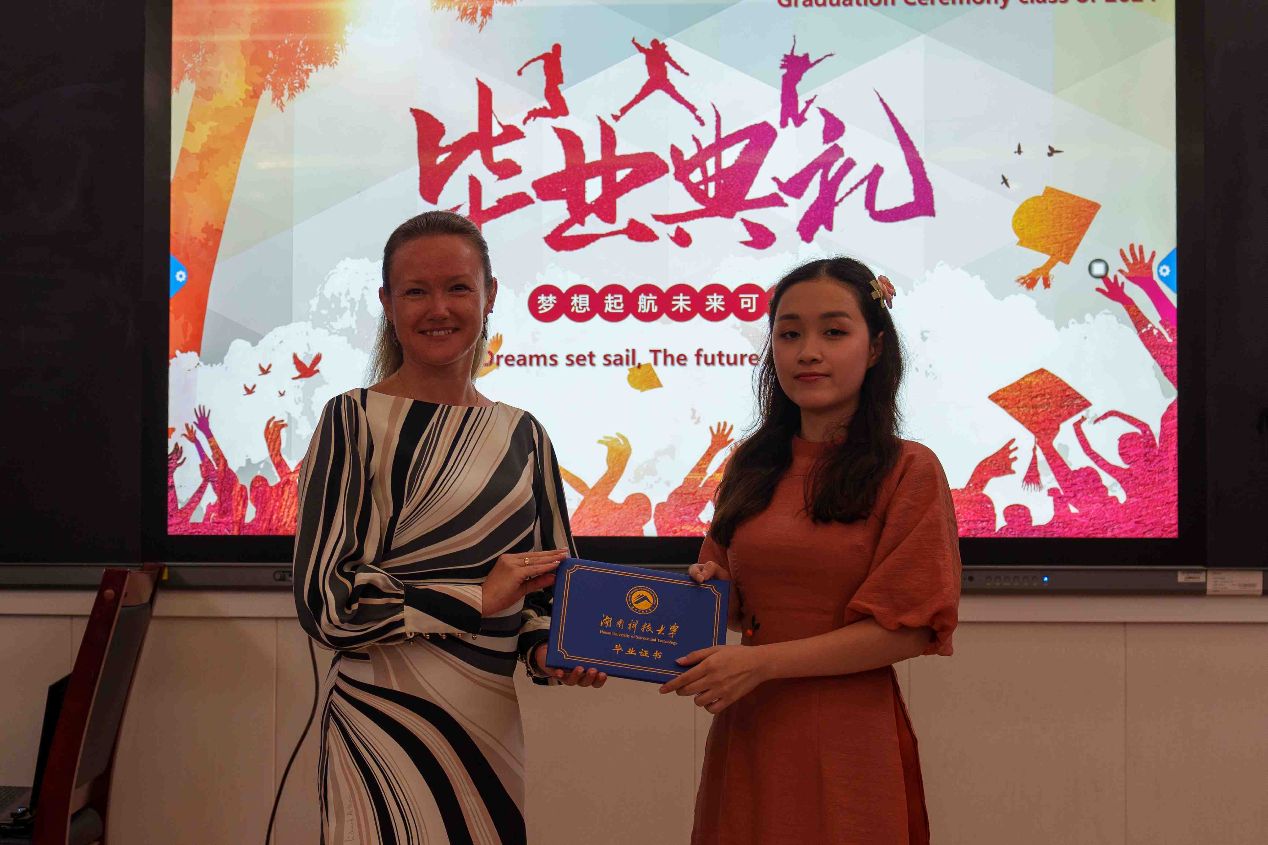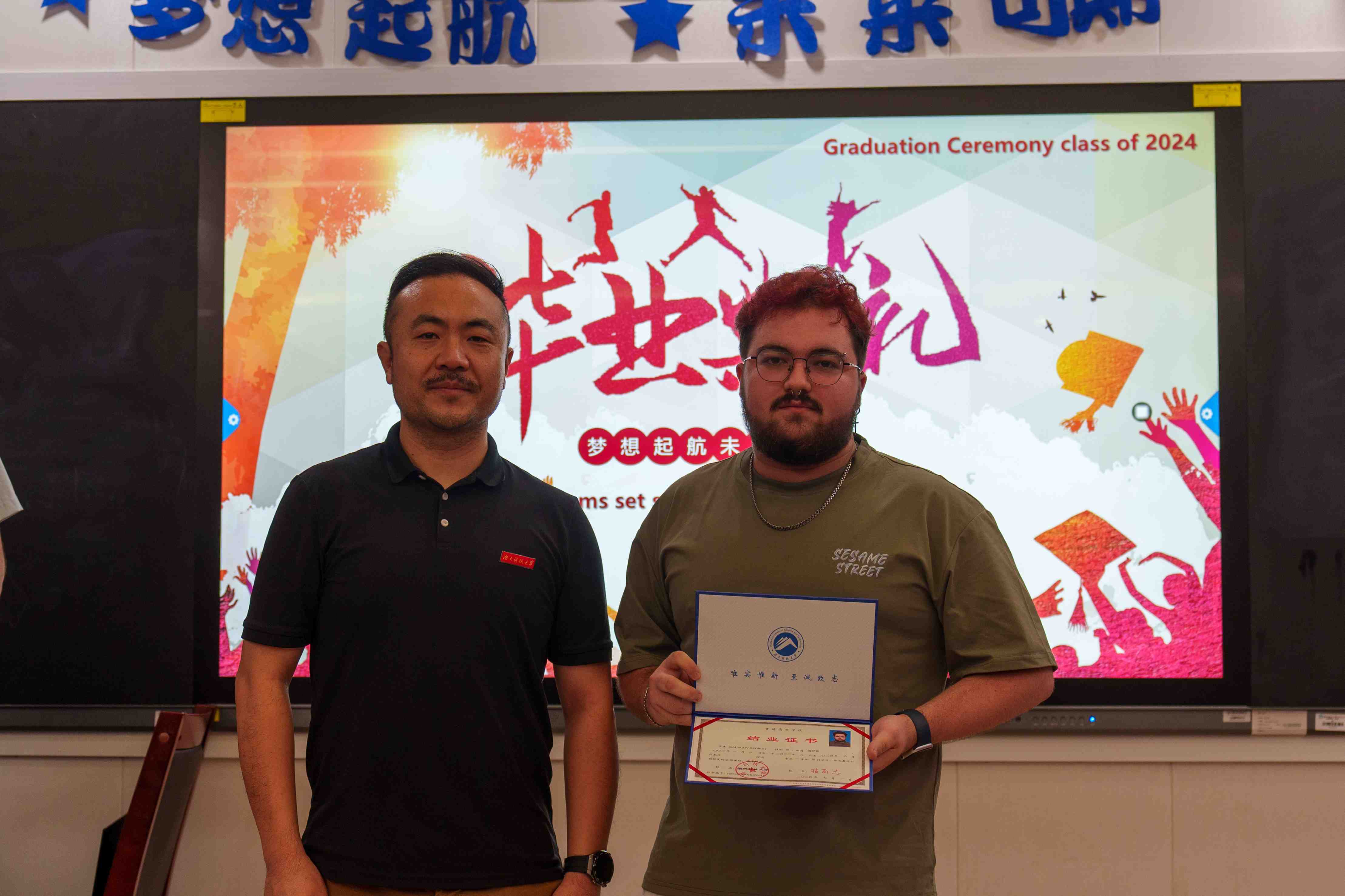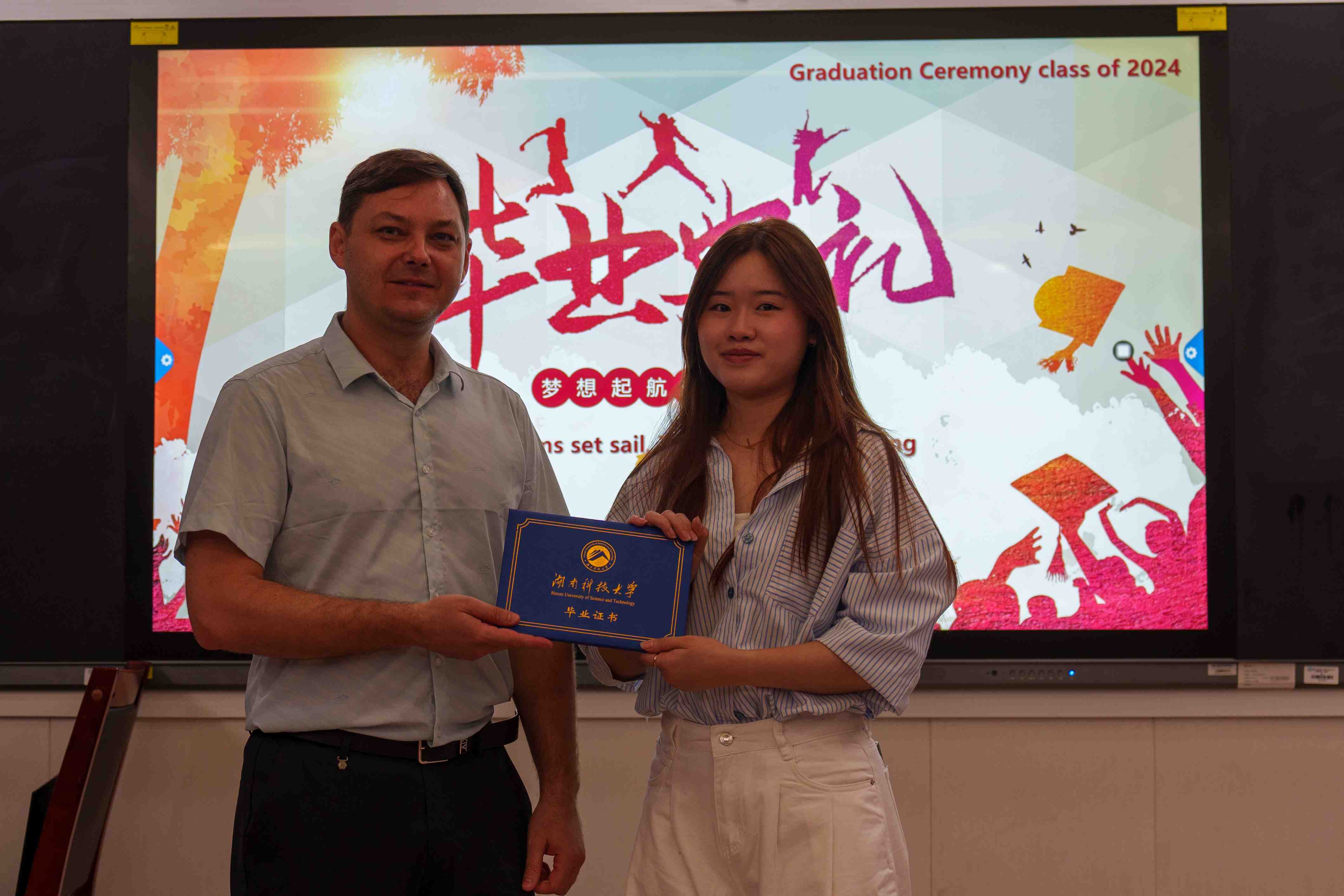紧接着,激动人心的时刻到来。学院领导为优秀国际学生毕业生们颁发了结业证书,这是他们国际学生涯的最好见证。毕业生们面带微笑,满怀激动地从领导手中接过证书,这一刻的荣耀与自豪将永远铭记在心。为了留下这美好的瞬间,老师们和所有的同学们一起合影留念。随着快门声的响起,一张张照片记录下了这一刻的欢笑与泪水,也见证了国际学生们的成长与蜕变。