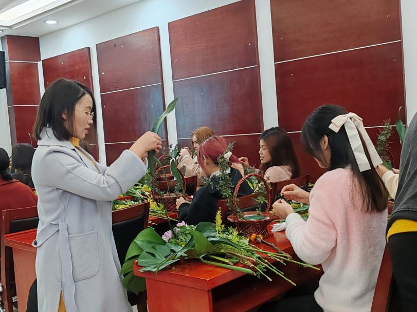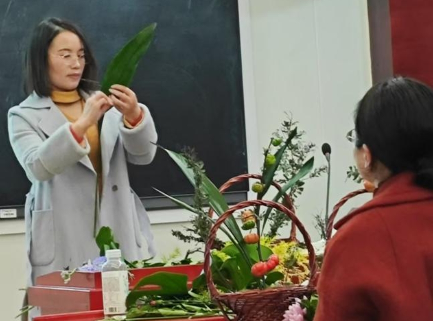 活动伊始,廖金花老师详细讲解了插花的基本技巧、色彩搭配以及不同花卉的象征意义等知识。不同于西方插花的明艳张扬,中国传统插花更多的是古朴雅致,体现出中国人的含蓄内敛。中国插花的种类菊花、一叶兰、龟背叶、柿子等,象征着事事顺心、吉祥如意。