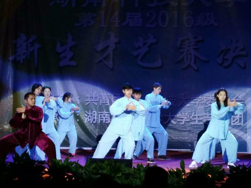 太极为我校国际交流处颇费心思为留学生安排的特色“中国文化”课的一部分。学生们非常喜欢这类课程,平时勤学苦练,水平就不错。此次登台,统一的中国服饰,整齐连贯的动作,让他们的“中国味”更浓了,场上掌声不断。