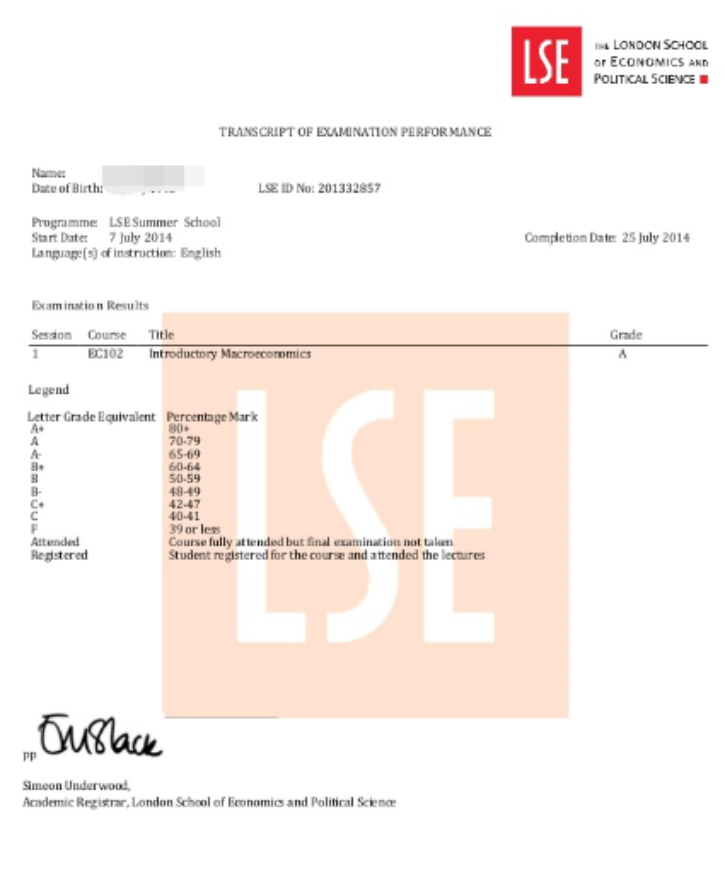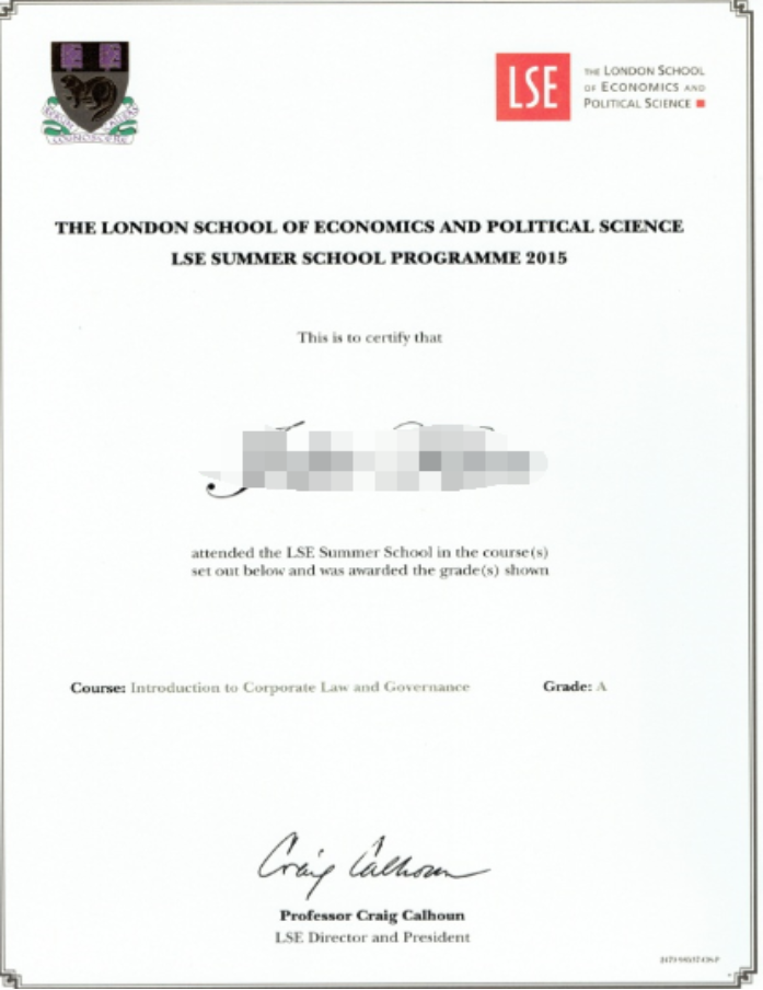 图:LSE暑期课程成绩单与证书