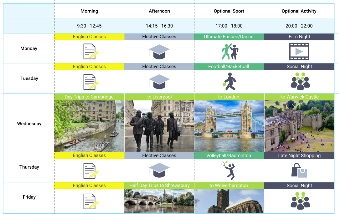 • 每周一次的短途旅行,包括牛津、剑桥、利物浦、伯明翰等旅行可选;