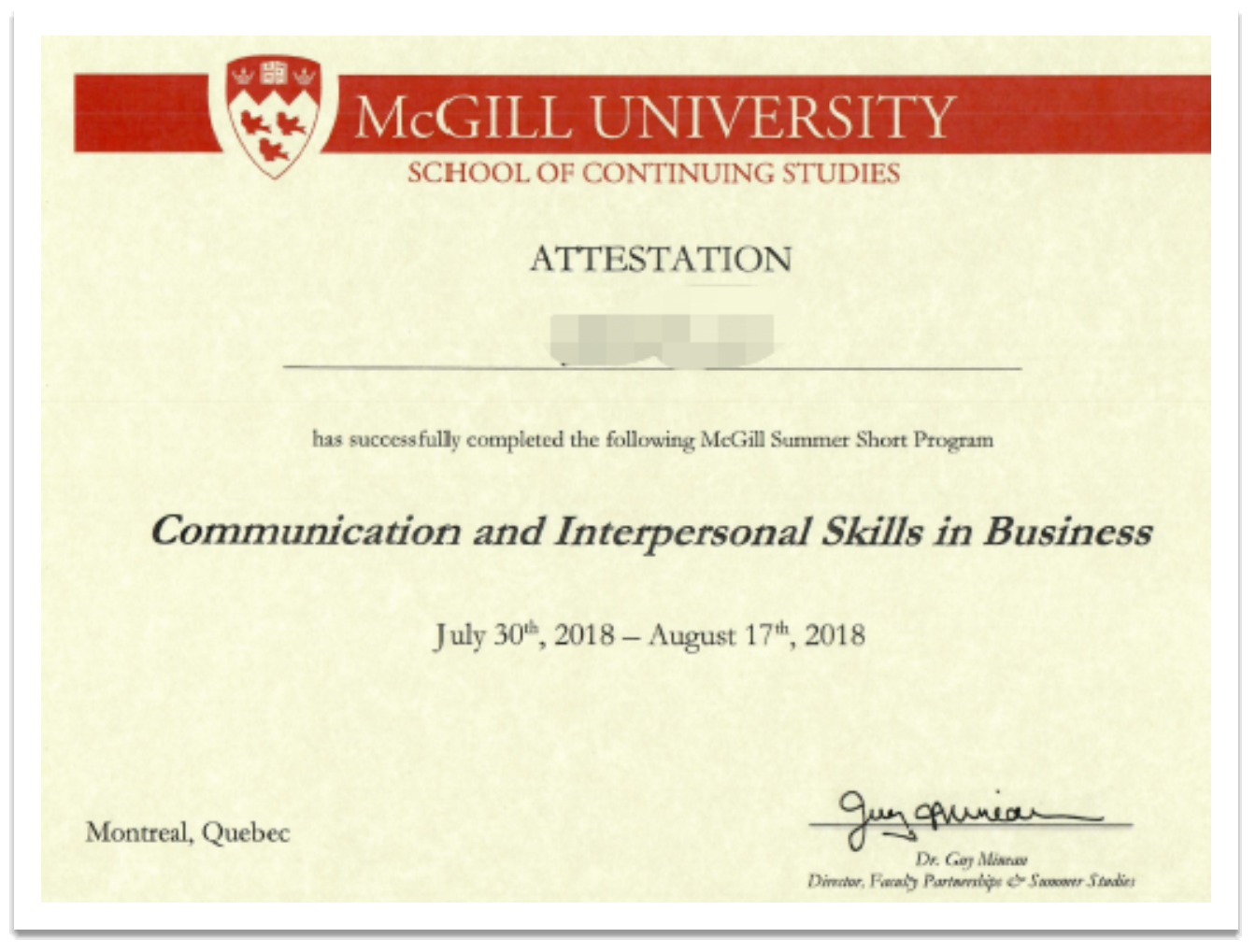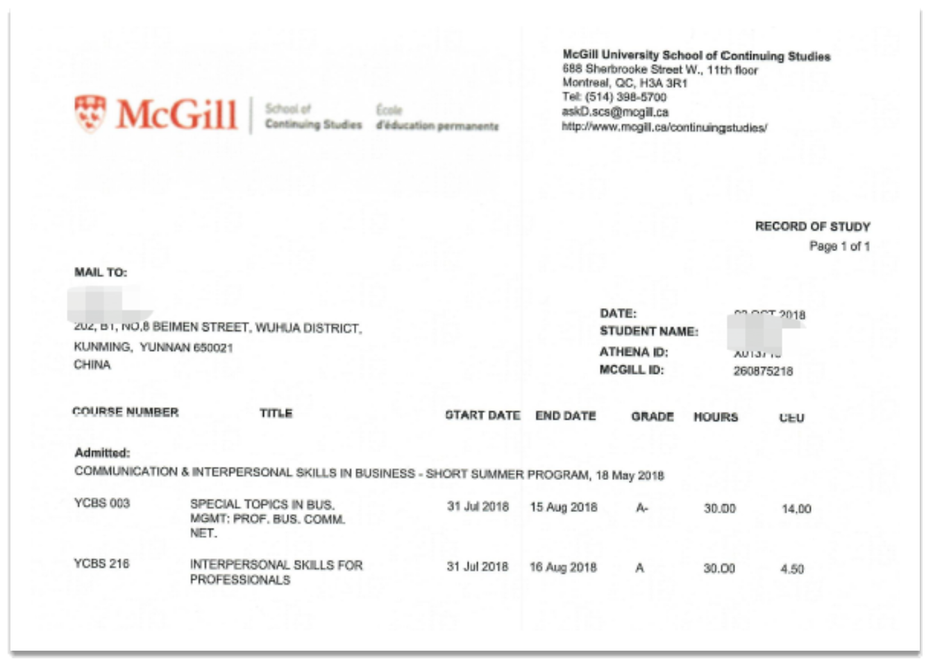 【课程成绩单】可获得麦吉尔正式的课程成绩单,为个人简历添砖加瓦;