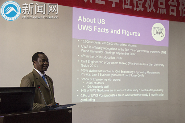 会上,Dr.David.Ngzi简要介绍了西苏格兰大学的基本情况。他表示,西苏格兰大学(原佩斯里大学)位于英国的苏格兰西南部,是一个多学科综合性教学与研究机构,创建于1897年,是英国政府正式批准成立的国立大学。2018年西苏格兰大学(UWS)在泰晤士高等教育世界大学排名中被官方认可属于世界大学的前3%之列;同时,在2017年泰晤士高等教育世界年轻大学排名中名列前200。西苏格兰大学现有在校学生10,000余人,学生来自40多个国家和地区。其化学工程专业历史悠久,且与国内多所大学都有科研合作,该专业的学科就业率在2015年和2016年分别是100%和95%,学生毕业后就业前景广阔。此外,Dr.David.Ngzi表示,该校还对我校去留学的学生有一系列优惠政策。