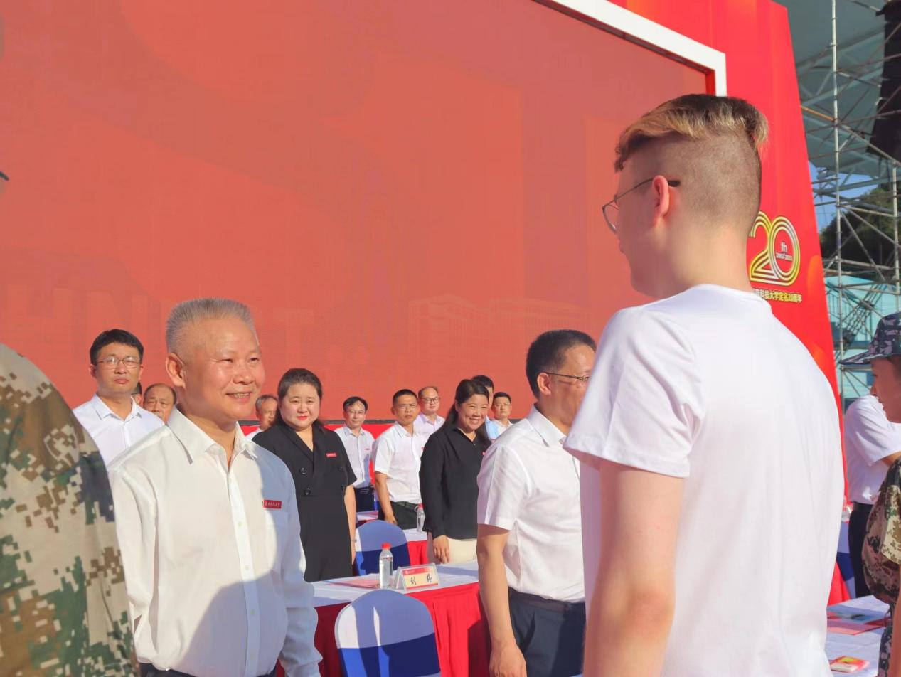 随后,24位新生代表上台,展开佩戴校徽仪式。国际学生谭波(俄罗斯)也在队列之中,由“时代楷模”万步炎教授为其佩戴校徽。礼毕,他与其他新生一齐敬礼,表达致谢。