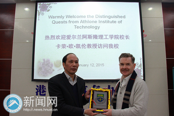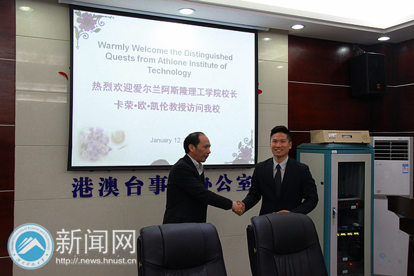 112日,爱尔兰阿斯隆理工学院(Athlone Institute of Technology)校长Ciarán ó Catháin教授、亚洲区总裁孟晶先生以及东方教育研究院副院长霍阿玲女士来校访问。我校校长李伯超、副校长刘友金接待了来宾一行。双方就两校开展教育交流和项目合作等方面进行座谈,教务处、招生就业处及对外联络处等相关部门负责人参与会谈。